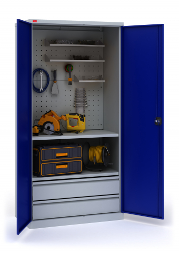 В комплектацию шкафа ИП-1/1 входит: корпус шкафа, 2 полки ИП-1, 2 перфорированных экрана ИП-1, 2 выдвижных ящика ИП-1, 2 удлиненные полки, 1 укороченная полка, 1 держатель ключей, 10 крючков длиной 8 см. Шаг перфорации для установки полок 83 мм. Нагрузка на полку - 60 кг, на ящик - 30 кг. Шкаф оборудован ключевым замок повышенной секретности и ригельной системой запирания.