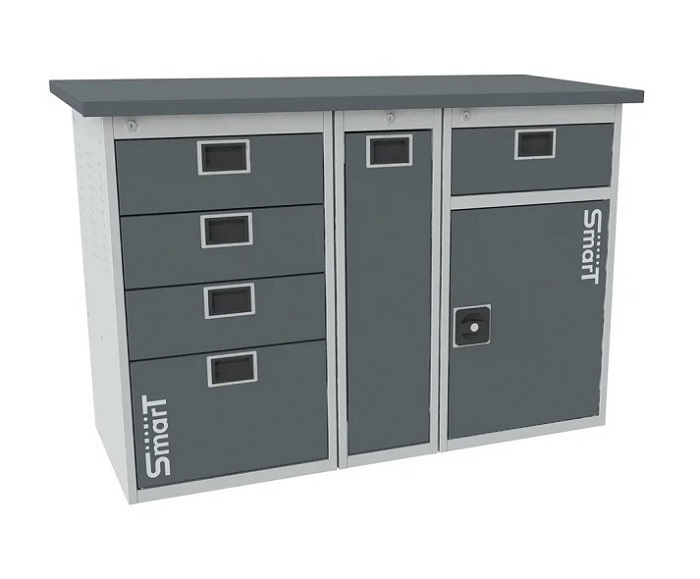 В комплектацию верстака входит: столешница 1280 SMART, тумба SMART 4, тумба SMART 1-1, тумба-пенал SMART. Столешница выполнена из фанеры 27 мм со стальной окрашенной накладкой 1,2 мм. Тумба SMART 4 комплектуется 4 выдвижными ящиками. Выдвижные ящики оборудованы телескопической системой полного выдвижения ящиков с фиксацией в закрытом состоянии (50000 циклов). Тумба SMART 1-1 комплектуется одной дверью, одним выдвижным ящиком и регулируемой по высоте полкой. Тумба-пенал SMART выдвигается на четырех телескопических направляющих и предназначена для хранения крупногабаритных инструментов и аксессуаров. Все тумбы закрываются ключевым цилиндровым замком. Секретность замка 2000 комбинаций (2 ключа в комплекте). Внутренние стенки дверей имеют универсальную перфорацию для размещения навесных элементов. Шаг квадратной перфорации (10 мм) - 38х38 мм, круглой (7 мм) - 25х38 мм. Возможна смена стороны открывания двери тумбы. Цвет верстака: корпус тумб - серый Ral 7035, столешница, двери тумб, лицевая панель ящиков - антрацит Ral 7016. Поставляется в разобранном виде.