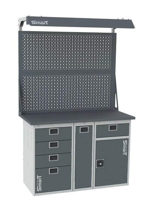Дополнительно на верстак можно установить: аксессуары на экран SMART, подвесной ящик Smart, поменять вид тумб, а также возможна установка системы мастер ключ